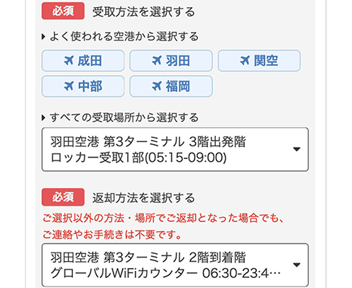※空港でお受取の場合は、必ず出国ゲート通過前にレンタル機器一式をお受取ください。 |